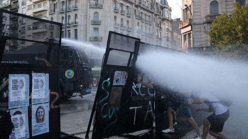 Manifestantes empurram uma cerca enquanto um canhão de água tenta dispersá-los durante um protesto em frente ao prédio d...