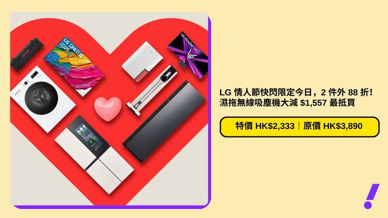 LG優惠|LG 情人節快閃限定今日,2 件外 88 折!濕拖無線吸塵機大減 $1,557 最抵買